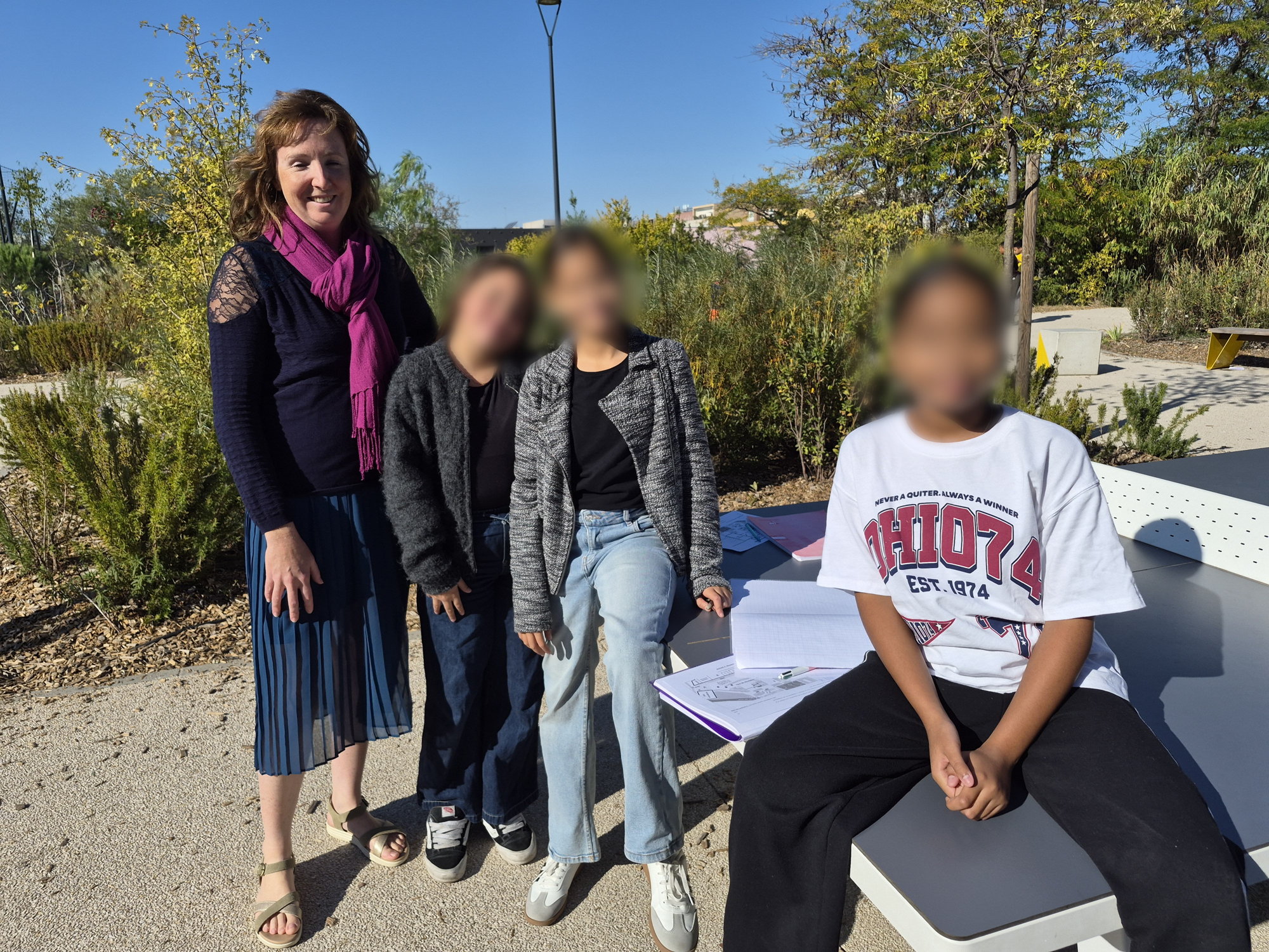Mme DUPUY, enseignante de Sciences de la Vie et de la Terre au collège Port Marianne, fait découvrir la botanique à ses nouveaux élèves de 6e en faisant classe dehors.