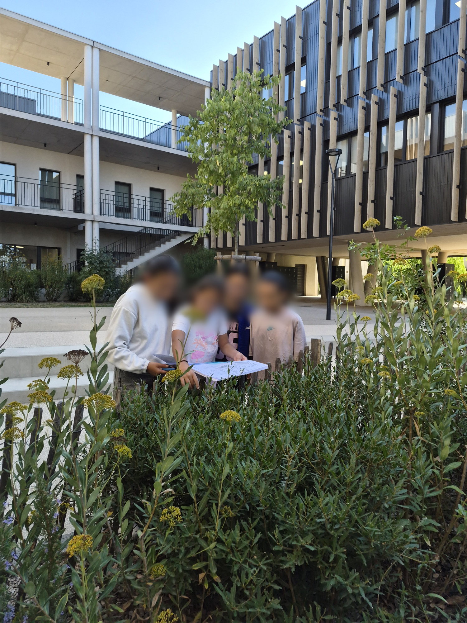 L' ensemble de la classe profite de ce beau soleil d'octobre tout en travaillant. Au programme : savoir se repérer sur un plan, reconnaître et décrire les plantes et surtout travailler en groupe.